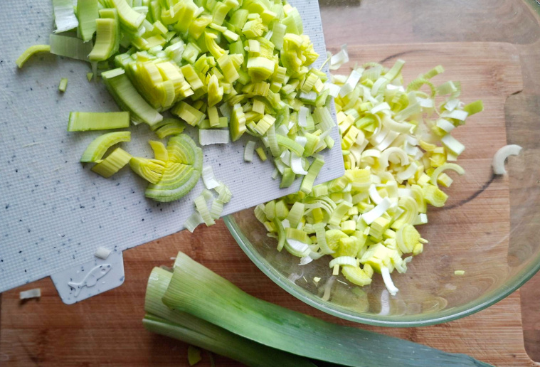 - Zacznij od pora. Oberwij zewnętrzne zwiędłe liście, a resztę pokrój cienko. Skrój cały - zarówno białą jak i zieloną część. Ja najpierw kroję wzdłuż na 4 części, a następnie na cienkie paseczki.