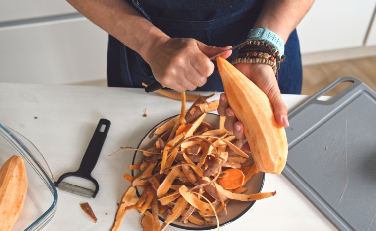 - Bataty obierz i pokrój w plastry o grubości ok. 5 cm.