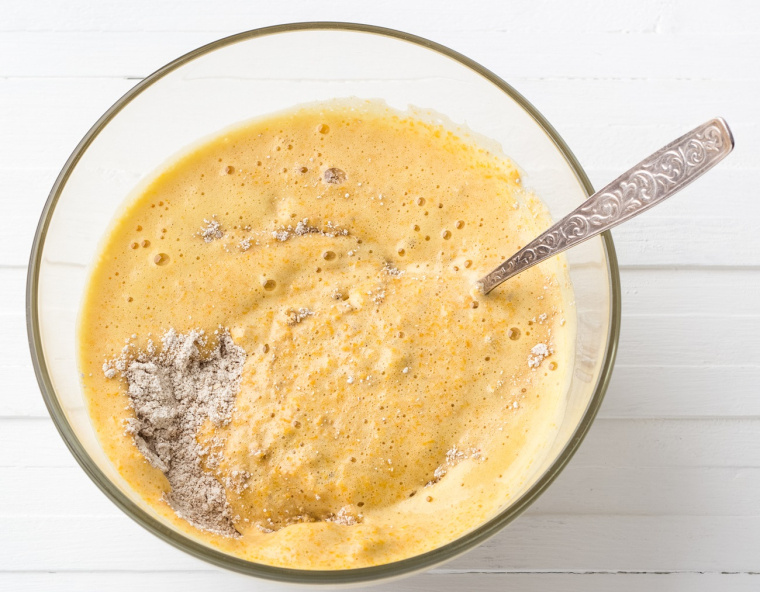 - Dodaj mąkę, proszek do pieczenia, sodę, cynamon, gałkę muszkatołową, olej, mleko, słodzidło i sok z cytryny. Wymieszaj wszystko dokładnie łyżką. Jeśli masa jest zbyt sucha, dolej odrobinę mleka. Jeśli za rzadka, dodaj trochę mąki. Powinna mieć konsystencję gęstego ciasta naleśnikowego.