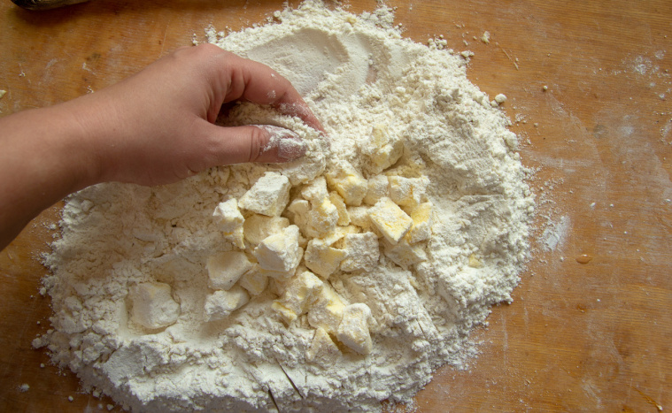 - Przesiej mąkę do miski, dodaj masło pokrojone w kawałki i rozcieraj palcami, aż uzyskasz sypką, konsystencję przypominającą kruszonkę.
