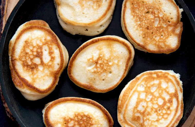 - Łyżką nakładaj ciasto, 1 łyżka to 1 racuszek. Smaż je pod przykryciem, aż się zrumienią. Przewróć delikatnie na drugą stronę i dosmażaj bez przykrycia. Racuszki mocno rosną na patelni, więc zostaw pomiędzy ciastem spore odstępy.
