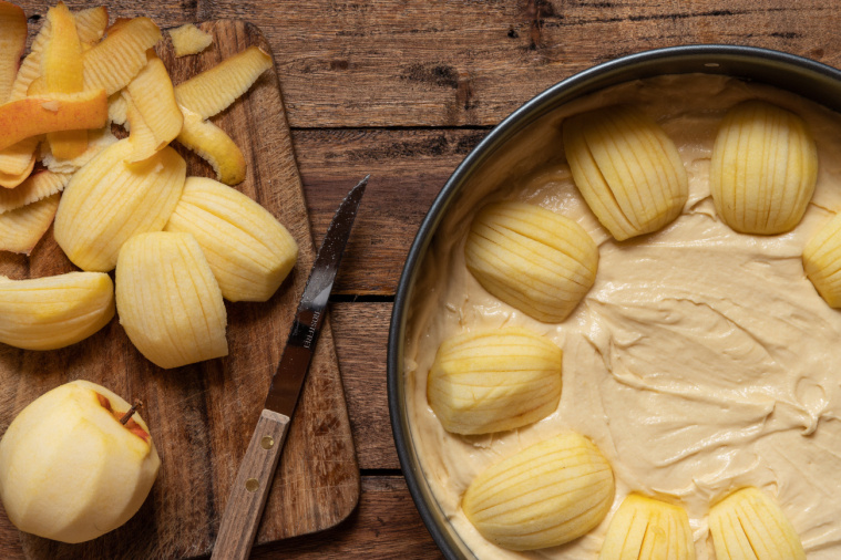 Puszyste ciasto z jabłkami robię niemal błyskawicznie, od lat z tego samego przepisu mojej mamy. Nie ma w nim żadnych skomplikowanych trików ani produktów. Jeśli użyjesz składników w pokojowej temperaturze, to ciasto na pewno wyjdzie. Wystarczy utrzeć masło z cukrem, jajkami, a na koniec połączyć z mąką i proszkiem do pieczenia. Ot, i cała filozofia. Jeśli chcesz przygotować jabłka tak jak na poniższym zdjęciu, to obierz je ze skórki, pokrój w ćwiartki i usuń z nich gniazda nasienne. Następnie ponacinaj je w paski, ale w ten sposób, by ćwiartki jabłek się nie rozpadły. Jabłka możesz też pokroić w zwykłą kostkę i posypać nimi wierzch ciasta. Będzie równie smaczne.