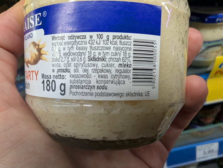 - chrzan Polonaise (62% korzenia chrzanu, zawiera dodatek mleka w proszku i 18 g cukru w 100 g)