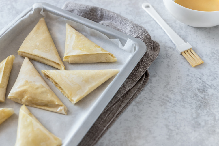 - Posmaruj wierzch każdego trójkąta roztrzepanym jajkiem.