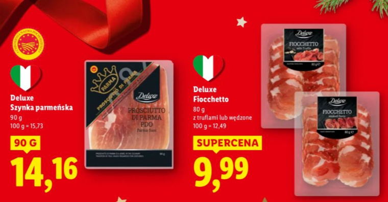 Szukaj fiocchetto w lodówkach z produktami Deluxe – te opakowania rzucają się w oczy, bo mają elegancką etykietę i włoską flagę. Jeśli masz w planach wieczór z deską serów, kolację dla dwojga albo po prostu lubisz włoskie smaki, kup od razu kilka paczek. W ramach tygodnia włoskiego dostaniesz również prosciutto di parma oraz takie rarytasy jak bresaola, salsiccia, speck i mortadela z truflami.