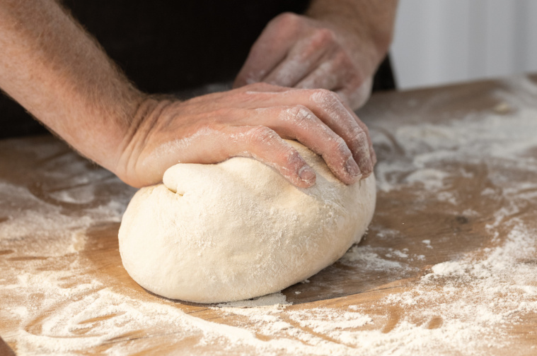 - Po tym czasie wyjmij go z miski na stolnicę podsypaną mąką. Ponownie złóż go kilkakrotnie, na koniec podwijając jego końce pod siebie. Uformuj z niego okrągły lub podłużny bochenek.