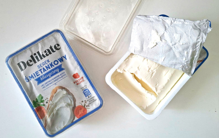 W oryginalnym przepisie krem ten przygotowuje się z serka philadelphia, lekko słonego i cudownie kremowego. Jednak nie oszukujmy się, nie dość, że jest on trudno dostępny, to kosztuje swoje. Na szczęście w Biedronce znalazłam bardzo smaczny jego zamiennik. Serek śmietankowy Delikate (na zdjęciu poniżej) kosztuje kilka złotych, a smakuje niemal tak samo jako wspomniana philadelphia. A do tego, kupisz go w każdej Biedronce.