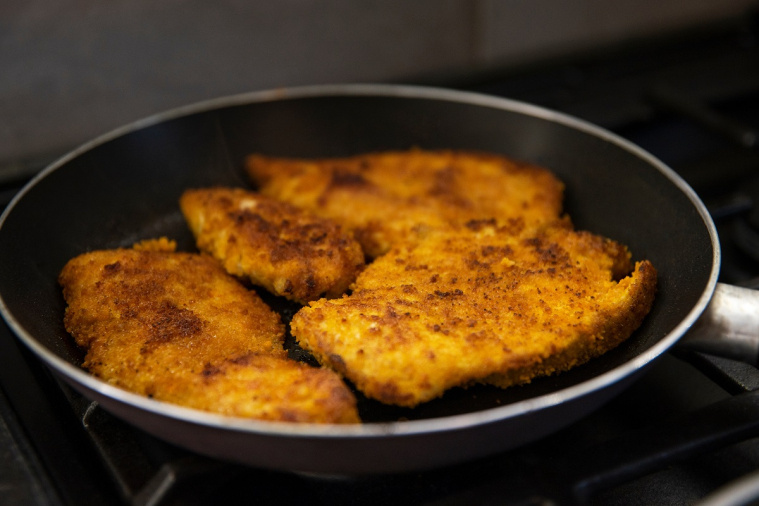 - Zapanierowane mięso smaż na rozgrzanym oleju, aż będzie rumiane i chrupiące z każdej strony.
