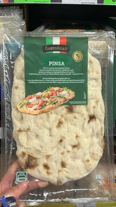 Pinsa jako gotowy produkt pojawiła się w polskich marketach stosunkowo niedawno. Najpierw można było dostać ją na tematycznych tygodniach włoskich organizowanych w marketach, a teraz jest już w stałej ofercie. Pinsa z Biedronki sprzedawana jest pod marką GustoBello charakterystyczną dla wielu włoskich produktów. Placek pinsa jest już wstępnie podpieczony, a w domu wystarczy wrzucić go do piekarnika dosłownie na kilka minut, by dopiec go, podgrzać i uzyskać efekt chrupiących brzegów.