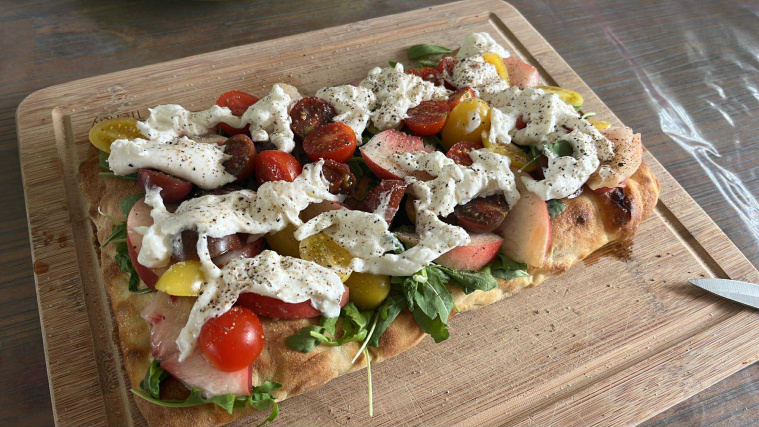 Oto moja wersja pinsy, którą przygotowałam z dodatkiem słodziutkich brzoskwiń, pomidorów, rukoli i właśnie burraty.