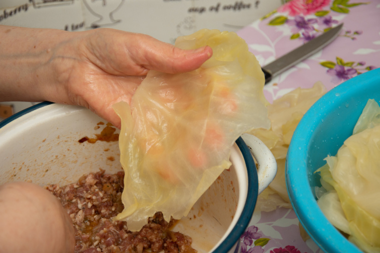Zazwyczaj nakładamy farsz na tę wypukłą stronę, ale Rączka pokazuje, że lepiej zrobić odwrotnie. Po obróceniu liścia naturalna krzywizna kapusty ustawia się na zewnątrz, co pozwala gołąbkowi lepiej zachować kształt. Gładka, miękka strona przylega do farszu jak miękka chusta.
