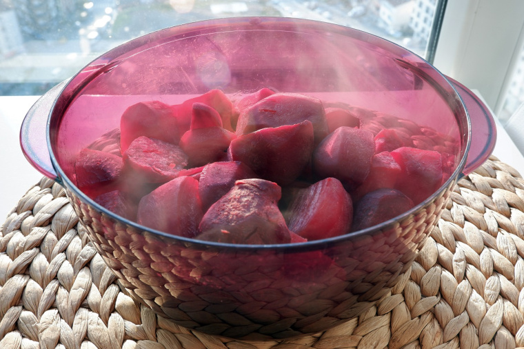 Jeśli masz parowar, napełnij jego dolną część wodą i rozłóż buraki „piętro” wyżej. Ustaw tryb parowania warzyw i poczekaj. Gotowanie buraków w ten sposób potrwa od 30 do 60 minut w zależności od ich wielkości. Po ugotowaniu od razu przelej je zimną wodą i pokrój na mniejsze kawałki - w takiej formie szybciej ci wystygną. Możesz postawić je na parapecie balkonu lub okna, by to przyspieszyć, lub zanurzyć miskę w większym naczyniu z zimną wodą.