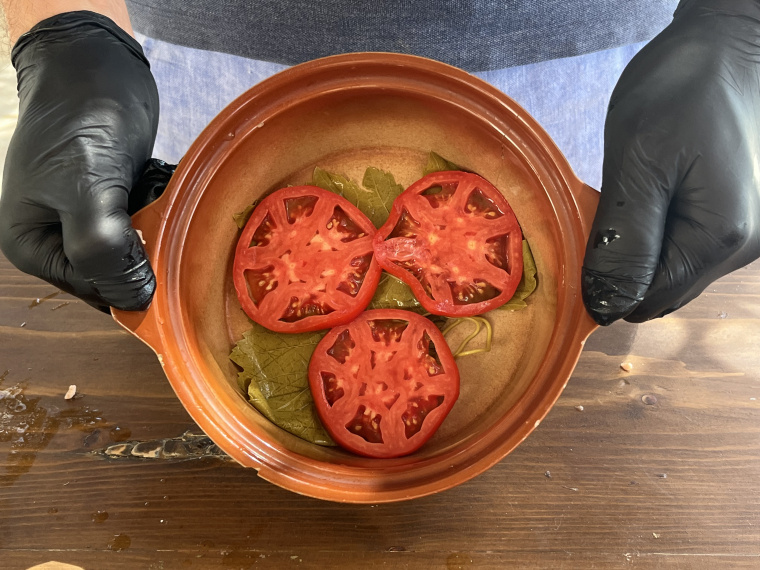 Nie zdziwił mnie farsz, nie zdziwiły mnie przyprawy, spodziewałam się wykorzystania liści winogron. Moją uwagę przykuł jednak sposób gotowania dolmades. Są one układane w glinianym naczyniu (podobnie jak nasze gołąbki w garnku). Na danie wykładane są liście winogron oraz grube plastry pomidorów. To genialne! Podpiekane pomidory uwalniają cudowny smak.