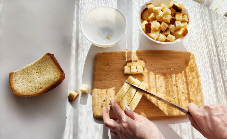 - Gdy czosnek zacznie pachnieć, dorzuć chleb pokrojony w kostkę lub dość grubo pokruszony. Całość zamieszaj, aby oliwa dokładnie otoczyła chleb.
