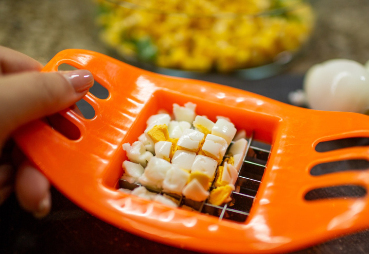 Jest sposób, który pozwala „pokroić” kilka jajek w czasie około 10 sekund. I nie chodzi tu o żadne skomplikowane techniki. W praktyce samo rozdrobnienie jednego potrwa 2-3 sekundy, bo jajka, mimo że ugotowane na twardo, są na tyle miękkie, że łatwo poddają się naciskowi. Sprawdziłam, więc z kilkoma jajkami uporasz się w sekundy. Znacznie krócej niż z użyciem noża.