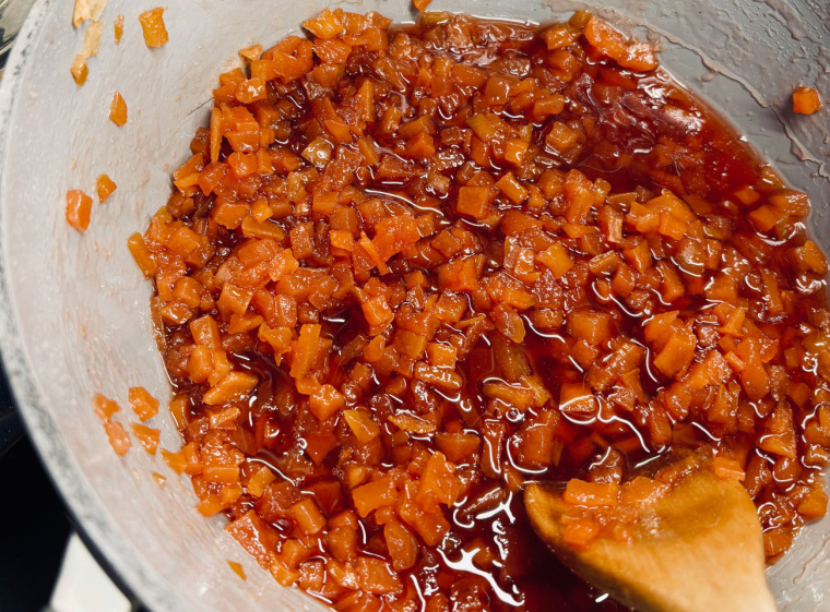 - Dodaj pigwę i gotuj ją, aż będzie miękka (czas gotowania zależy od tego, na jak duże kawałki pokroiłeś pigwę).
