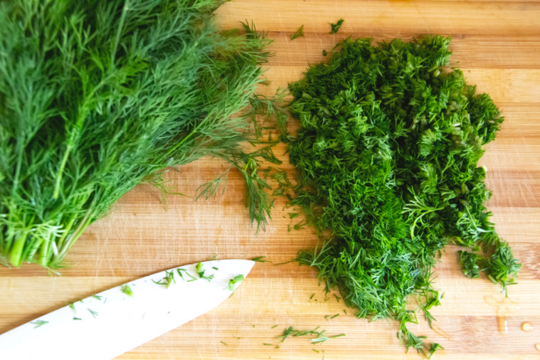 Na koniec poszatkuj koperek. Nie za drobno, raczej tak, jak robisz to do ziemniaków czy zupy.