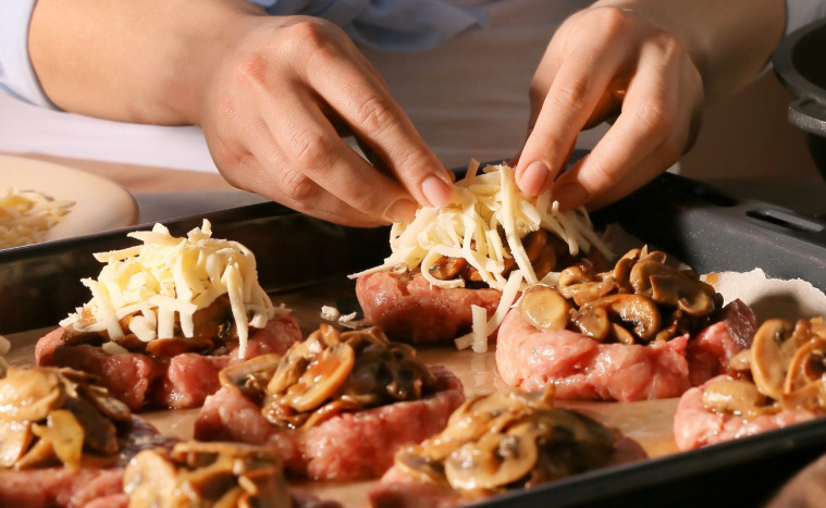 Tych kotletów nie smaży się na tłuszczu, tylko formuje z wgłębieniem w środku. Do środka wkłada się wcześniej podsmażone pieczarki z cebulą, a na wierzch porcję sera. Podczas pieczenia ser się rozpuszcza i lekko zapieka, a aromat grzybów przenika do mięsa.