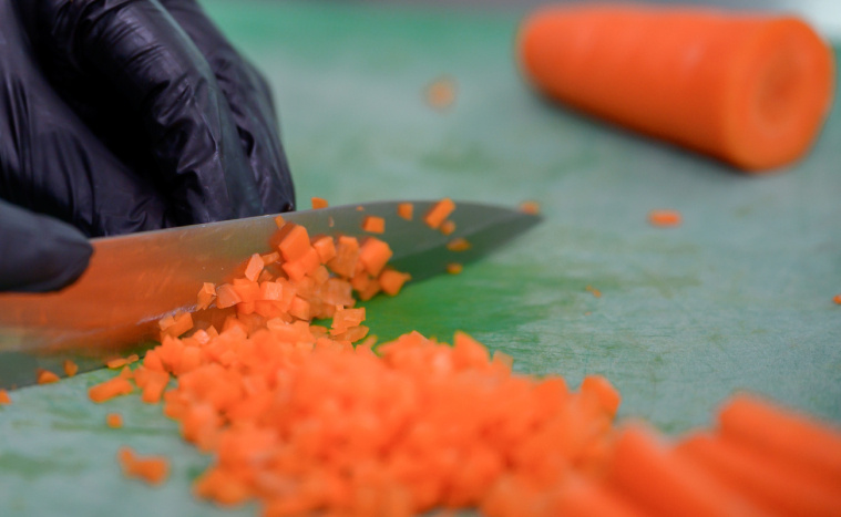 - Marchew, cebulę i pieczarki pokrój w drobną kostkę. Groszek odsącz na sicie.