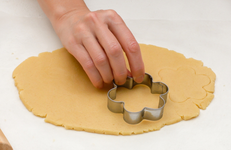 - Rozwałkuj je na grubość 3 mm. Za pomocą jednej foremki wytnij z niego ciasteczka. W co drugim ciastku zrób dziurkę na marmoladę np. za pomocą małej foremki do rurek. Możesz też wykorzystać gotowe wykrawacze do ciastek z dziurką (zrobisz je wtedy w wielu kształtach).