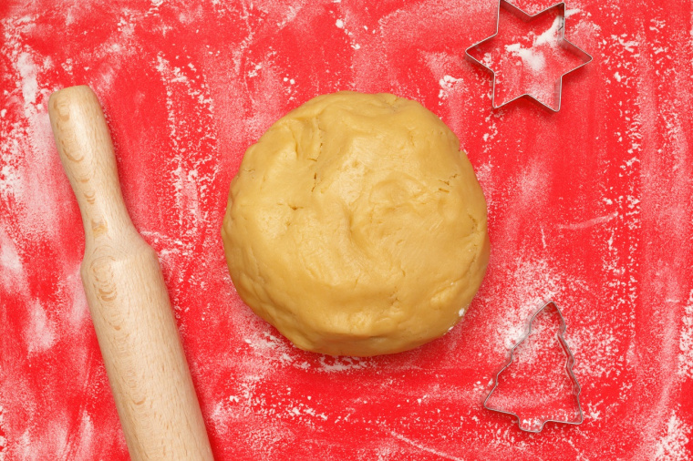 - Oderwij porcję ciasta, rozwałkuj ją na lekko posypanym mąką blacie na grubość około 3–5 mm. Wykrawaj dowolne kształty foremkami.