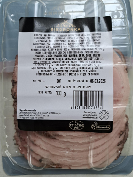 Boczek sądecki dostępny jest w wygodnych, 100-gramowych paczkach. Plastry są równo pokrojone i gotowe do użycia, bez konieczności proszenia o krojenie przy ladzie czy martwienia się o grubość plasterka. To rozwiązanie szczególnie docenią osoby, które cenią sobie porządek w lodówce i chcą mieć kontrolę nad ilością kupowanej wędliny.