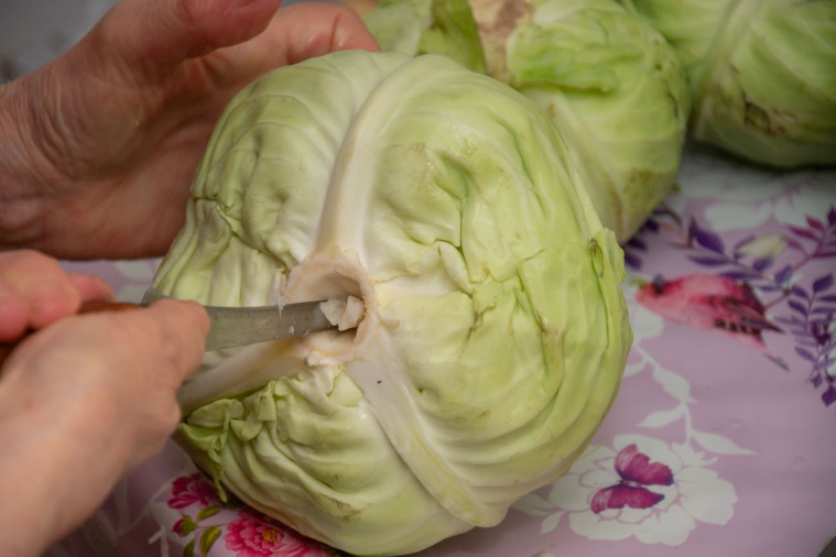 Zacznij od przygotowania młodej kapusty. Zdejmij z niej wszystkie uszkodzone wierzchnie liście. Wytnij głąb, ale bez rozkrajania kapusty, zupełnie jak na gołąbki z młodej kapusty.