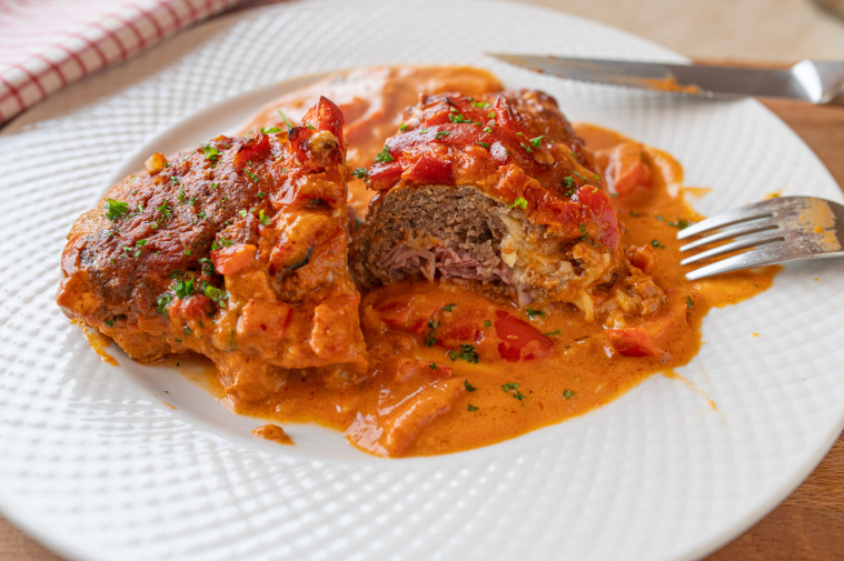 W środku rozłóż szynkę, ser i musztardę. Potem ciasno zwiń, jak roladę biszkoptową. Krótkie obsmażenie na patelni zamknie mięso i zatrzyma soki. Na koniec zalej wszystko sosem i piecz spokojnie przez godzinę, aż całość przejdzie aromatem papryki i przypraw.
