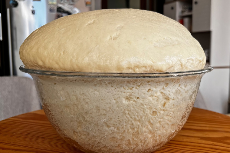 - Przelej zaczyn do reszty mąki, dodaj resztę składników (z wyjątkiem oleju) i wyrób ciasto. Na początku będzie kleić się do rąk, ale wyrabiaj do momentu, aż przestanie. Gdy ciasto będzie już elastyczne, dolej olej i wyrób ponownie, do połączenia się. Odłóż w ciepłe miejsce, aż podwoi swoją objętość (ok. 2 godziny).