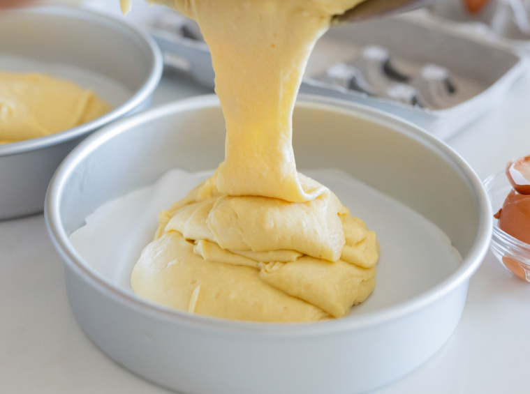 - Do miski przełóż masło i utrzyj je z połową szklanki cukru na jasną i puszystą masę. Białka oddziel od żółtek. Żółtka dodaj do masy maślanej i wymieszaj całość ze sobą. Następnie wlej śmietankę, cały czas miksując. Mąkę przesiej przez sito i dodaj do masy wraz z proszkiem budyniowym i proszkiem do pieczenia. Wymieszaj składniki do połączenia (ciasto będzie bardzo gęste). Z białek ubij sztywną pianę. Dodaj do niej po łyżce pozostały cukier, cały czas ubijając. Na koniec wsyp mąkę ziemniaczaną i wymieszaj. Ubitą pianę połącz z pozostałym ciastem. Wymieszaj całość razem delikatnie łopatką.