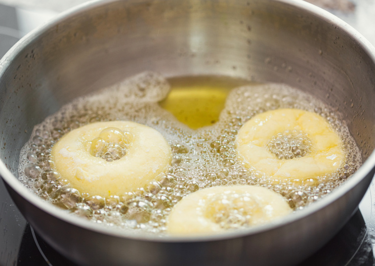 - Smaż po 3 sztuki, w równych odstępach. To moment, w którym większość osób przyspiesza. Ja trzymam równe odstępy, żeby oponki miały miejsce i żeby olej mógł je równomiernie opływać.