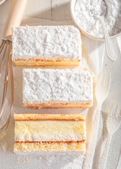 Przed podaniem kremówkę komunijną oprósz obficie cukrem pudrem i pokrój w zgrabne kawałki.
