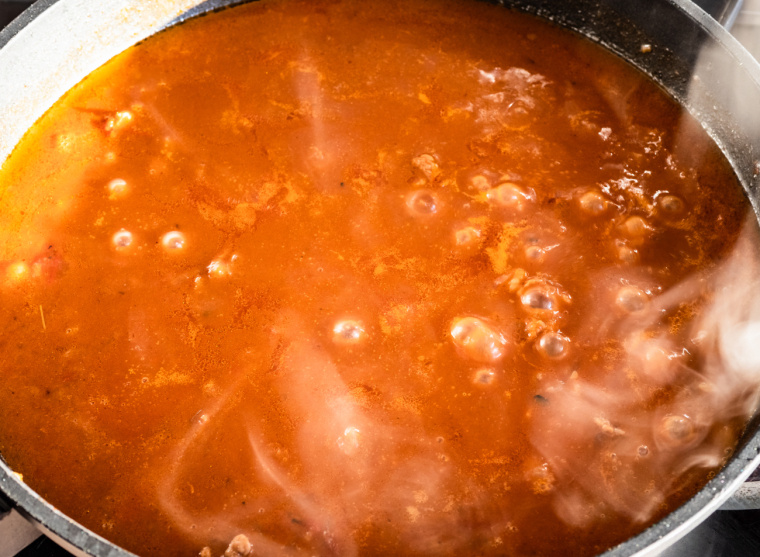 - W tym czasie do osobnego rondelka wlej karton soku pomidorowego, dodaj szklankę wody i puszkę pomidorów. Zacznij podgrzewać.