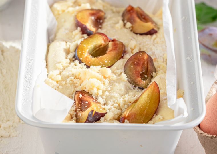 - Keksówkę wysmaruj masłem i obsyp mąką. Przelej do niej ciasto. Wyrównaj wierzch. Ułóż na nim połówki śliwek, obtoczone w mące (skórką do dołu).