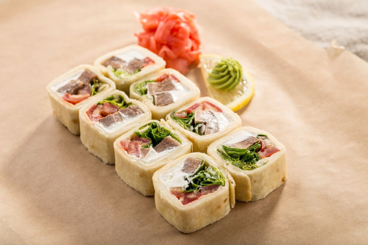 Jak zrobić roladki w stylu sushi? Ułóż tortillę (pszenną lub wieloziarnistą, jak wolisz) na płaskiej powierzchni, najlepiej od razu wyścielonej folią spożywczą lub pergaminem. Warto przyciąć brzegi od góry i od dołu, bo okrągły kształt utrudni zwijanie. Ścinki możesz potem podpiec i chrupać jak chipsy. Rozsmaruj serek. Umieść wszystkie składniki farszu w jednej linii, zamiast rozkładać je na całej powierzchni. Złap za tortillę i ciasno owiń ją wokół dodatków, a potem zroluj już do końca jak zawsze. Owiń folią spożywczą i włóż do lodówki. Po schłodzeniu roladki będą lepiej trzymać formę.