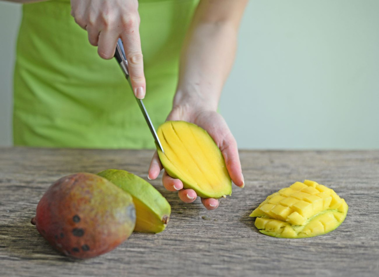 - Zacznij od przygotowania mango. Odkrój miąższ blisko pestki, potnij go w kratkę, jak na powyższym zdjęciu. Potem skórkę wygnij w drugą stronę, żeby owoc był łatwiej dostępny. Teraz wystarczy, że odetniesz go od pestki.