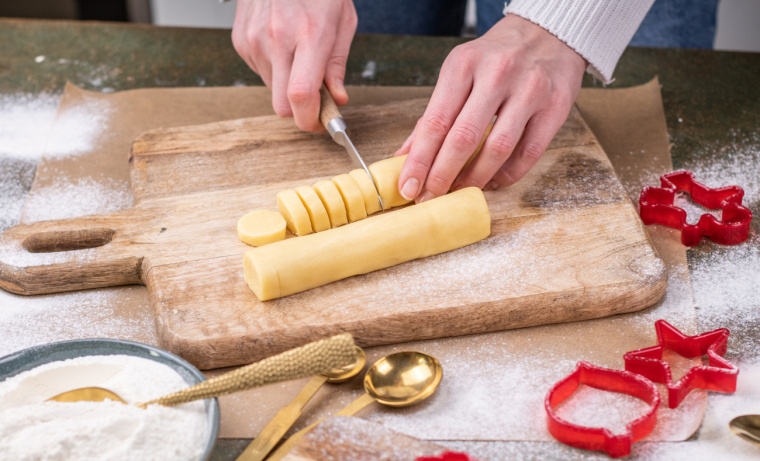 - Po tym czasie wyjmij ruloniki z folii i pokrój ostrym nożem na szerokość 1 centymetra. Ułóż je na blaszce z papierem do pieczenia. Piecz w piekarniku nagrzanym do 180 stopni przez 15-20 minut, aż się lekko zrumienią. Ostudzone ciastka możesz udekorować cukrem pudrem.