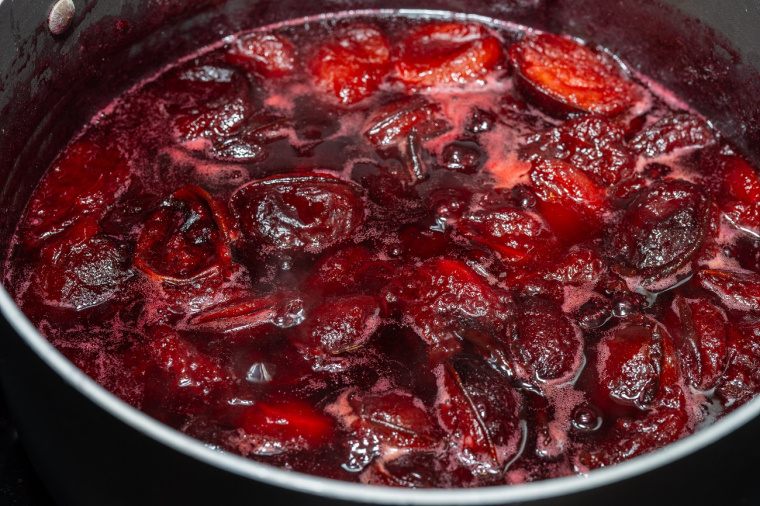 - Przełóż śliwki z sokiem do garnka z grubym dnem i gotuj na małym lub średnim ogniu przez 1-2 godziny. Regularnie mieszaj, aby zapobiec przypaleniu się. Za pomocą łyżki i palca sprawdź, czy owoce są już gotowe (sposób opisany powyżej).