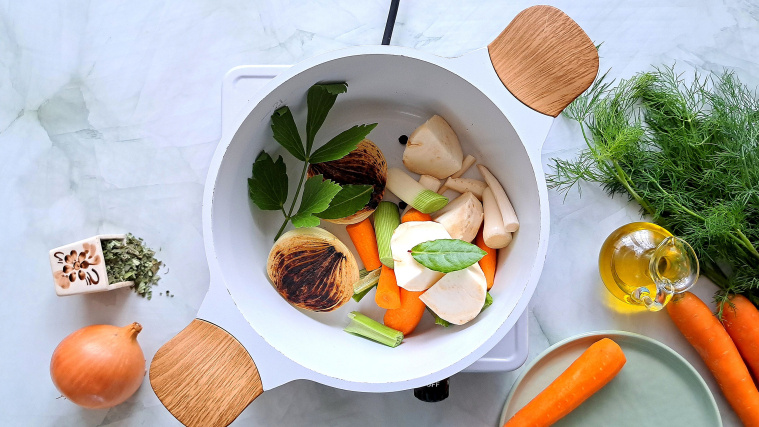 - Wrzuć jarzyny do garnka. Dodaj liście laurowe, ziele angielskie i lubczyk (może być suszony). Zalej wodą. Gotuj wywar przez około 30–45 minut, na małym ogniu.