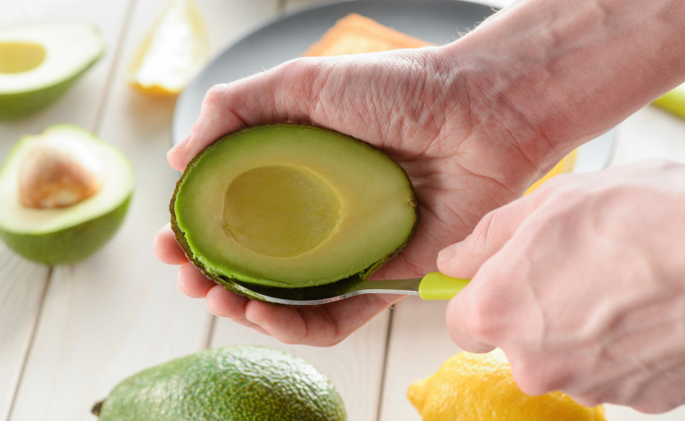 - Awokado przekrój, usuń pestkę i wydobądź miąższ.