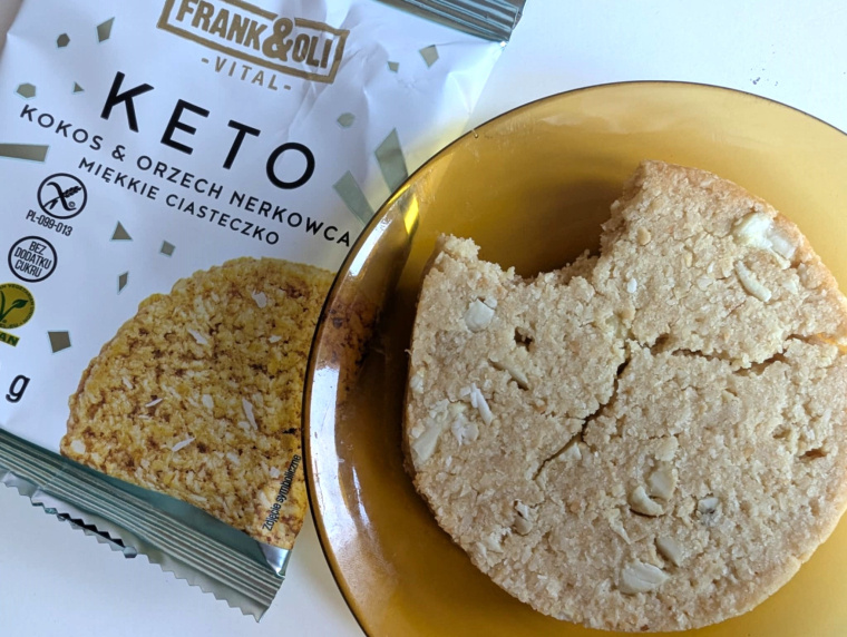 Ciastko Frank&Oli w wersji Kokos&Orzech Nerkowca należy do moich ulubionych z całej serii, choć zdarza mi się też kupować inne. Ciasteczko nie było pieczone, jest dość wilgotne, mięciutkie i delikatne. To podobny typ ciastek, co dawne gotowane ciastka owsiane z PRL, ale o innym składzie. Wyczuwalne są kawałki orzechów - w sam raz do rozgryzienia. Jest bezglutenowe, odpowiednie dla wegan i ma sporo błonnika - 1 sztuka zawiera niemal 17 g. A to wszystko na słodko, czyli najprzyjemniej.