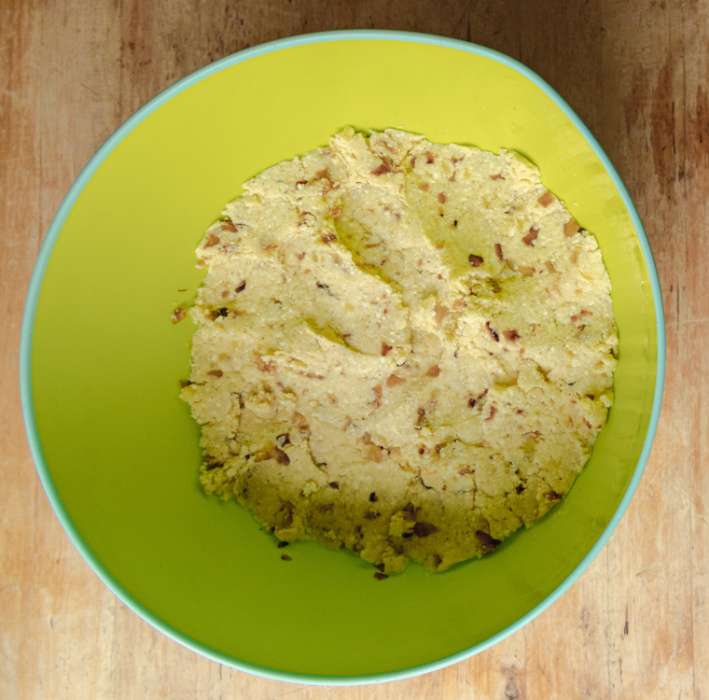 - Przestudzony smalec rozpuszczony wcześniej na patelni dolej do ciasta i połącz składniki. Konsystencja masy powinna być jak na klasyczne ciasto naleśnikowe.