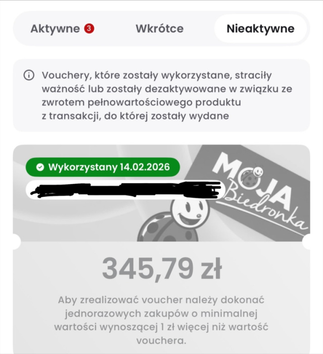 Już po zakupach w aplikacji w zakładce „Vouchery, Wkrótce", zgodnie z oczekiwaniami, pokazał się Voucher na zakupy o wartości 345,79 zł.