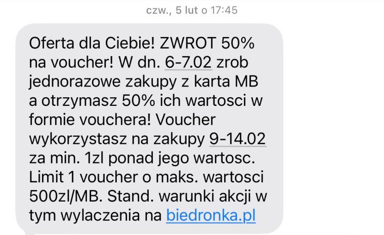 Zgodnie z treścią wiadomości SMS, promocja polega na tym, że po zrobieniu zakupów we wskazanych dniach (w tym wypadku był to 7.02 i 6.02), połowę wartości zakupów dostaje się w formie vouchera, który można wykorzystać w innym terminie.