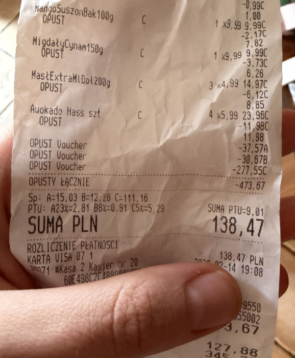 Wybrałam się do sklepu i zrobiłam kolejne duże zakupu spożywcze. Ich całkowita wartość wyniosła 611 zł, bieżące promocje (tak, też się łapały!) obniżyły rachunek o 127,88 zł, a voucher obniżył wartość rachunku do zapłacenia do 138,47 zł. Oznacza to, że realnie na paragon miałam nabite zakupy za 611 zł, a zapłaciłam za nie dzięki wyjątkowej akcji 138,47 zł.