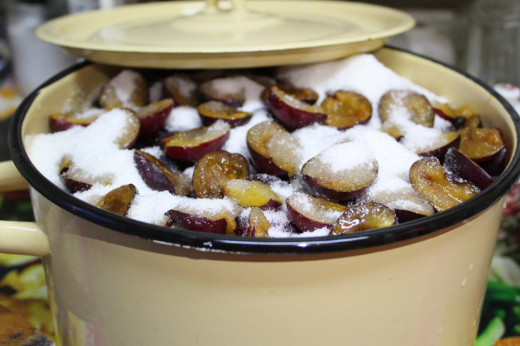 - Śliwki węgierki umyj i wypestkuj. Układaj je w dużym garnku warstwami na przemian z cukrem (każdą warstwę śliwek posyp cukrem). Ostatnią warstwą powinien być cukier. Całość skrop octem i zostaw (bez przykrywania) na 12 godzin (najlepiej na całą noc).