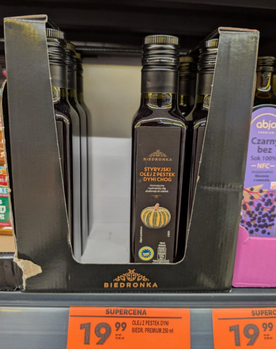 W Biedronce, na regałach z różnościami, odszukałam olej z pestek dyni styryjskiej tłoczony na zimno, sprzedawany w butelce 250 ml za 19,99 zł. To produkt klasy premium, ale jego cena jest naprawdę przystępna – zwłaszcza biorąc pod uwagę, jak mało potrzeba go na raz. Używam go jak przyprawy. Kilka kropel wystarczy, żeby go poczuć i zauważalnie zmienić smak dania nie do poznania.