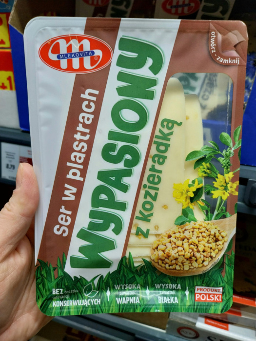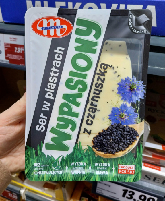 Niedawno w lodówkach z serami zauważyłam 2 nowe produkty: ser w plastrach „Wypasiony” z kozieradką i ser w plastrach „Wypasiony” z czarnuszką, oba firmy Mlekovita. Ponieważ znam i lubię mleko „Wypasione”, a te sery są właśnie z polskiego mleka, skusiłam się także na tę nowość. Było warto. To teraz moje 2 pewniaki na domowe śniadania i nie tylko.