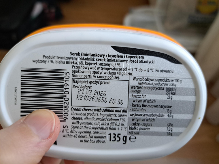 Producent jasno podaje, że w składzie znajduje się 7% wędzonego łososia atlantyckiego, do tego serek śmietankowy, białka mleka, sól oraz suszony koperek. Krótka lista, bez zbędnych dodatków, aromatów czy zagęstników, które często pojawiają się w tego typu wyrobach. Całość jest pasteryzowana i przeznaczona do spożycia na zimno, dokładnie tak, jak większość serków kanapkowych.