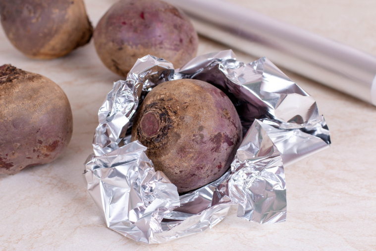 - Buraki umyj, usuń z nich ogonki, ale nie obieraj. Zawiń je w folię aluminiową i ułóż na blaszce. Piecz w piekarniku nagrzanym do 180 stopni przez 1 godzinę. Upieczone buraki odstaw do ostygnięcia i obierz ze skórki.